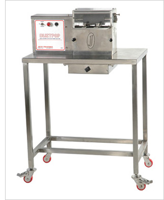 Three adjustable wheels grips and draws the pack under a rubberized roller. The rubber roller presses down on the blister cavities-pushing out the product. The machine is adjustable to suit most pack sizes. The machine is suitable to open aluminum foil as well as glassine foil. Opened product is collected in a box and packaging material is collected at the back.