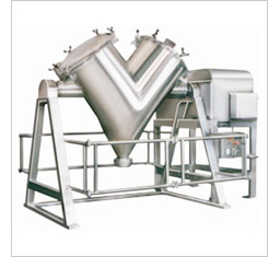 Powders or granules that are to be mixed are loaded in the vessel. Vessel rotates around its central shaft, driven by the drive system. As the vessel rotates, powders start flowing due to gravitational force. Due to the "V" shape of container, the materials get sufficient continuous movement and hence requirement of RPM is medium that results in good quality blending / lubrication of granules without size reduction.