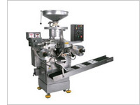 The products from the hopper passes through a stainless steel feeding system and goes to sealing roller cavities where laminated foils, drawn from two rollers, packs and seals the products in a continuous strip. The strip then passes through vertical and horizontal cutter assemblies to deliver the desired sizes of strip packages.